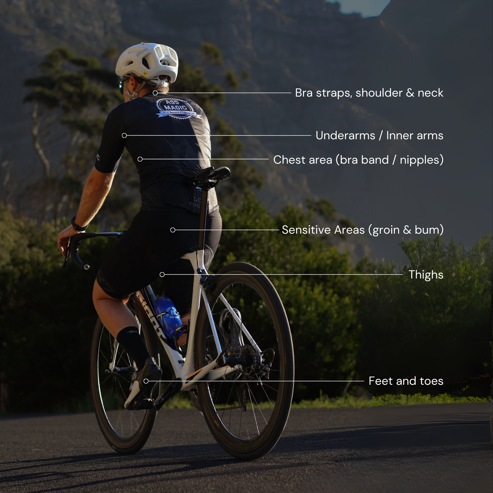 ASS MAGIC can also be applied to the chamois of your cycling shorts, focusing on the area in contact with your saddle. Moreover, you can apply ASS MAGIC to any other area where you have previously experienced chafing.